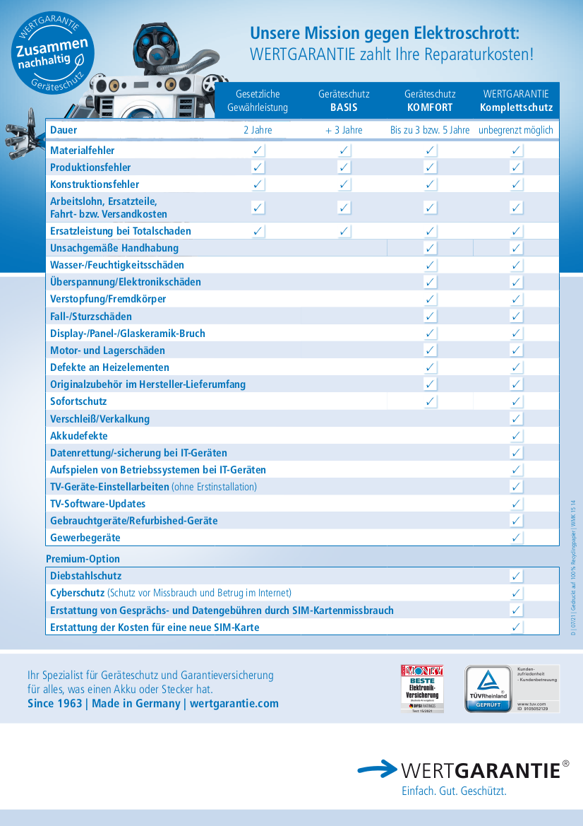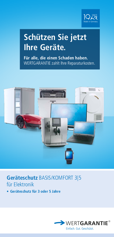 Mit unserem Geräteschutz BASIS können Sie jetzt beim Kauf Ihr Neugerät nach Ablauf der 2-jährigen Gewährleistung für weitere 3 Jahre gegen Reparaturkosten durch Material-, Konstruktions- und Produktionsfehler schützen. Diese Geräte können Sie schützen: